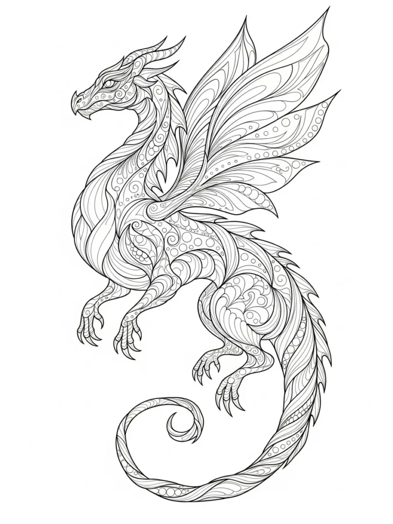 I really enjoy pages like this because they feel peaceful while still being powerful. Coloring the wings is especially satisfying since the patterns let me play with gradients and soft blends. Some people love bold fiery dragons but this one feels calm and grounding which is perfect for slow evenings when I want to relax and still feel creative. It is the kind of page I can return to again and again without getting bored.