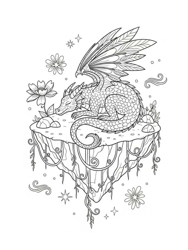 This coloring page features a sweet peaceful dragon curled up on a small floating island surrounded by flowers leaves and tiny stars. The dragon has soft rounded features and neatly layered scales that give it a gentle friendly feel rather than a fierce one. Delicate wing details stretch upward while vines and roots hang below the island adding movement and charm. The line work is clean and fine with a lovely balance of detail and open space that keeps the design light and whimsical.