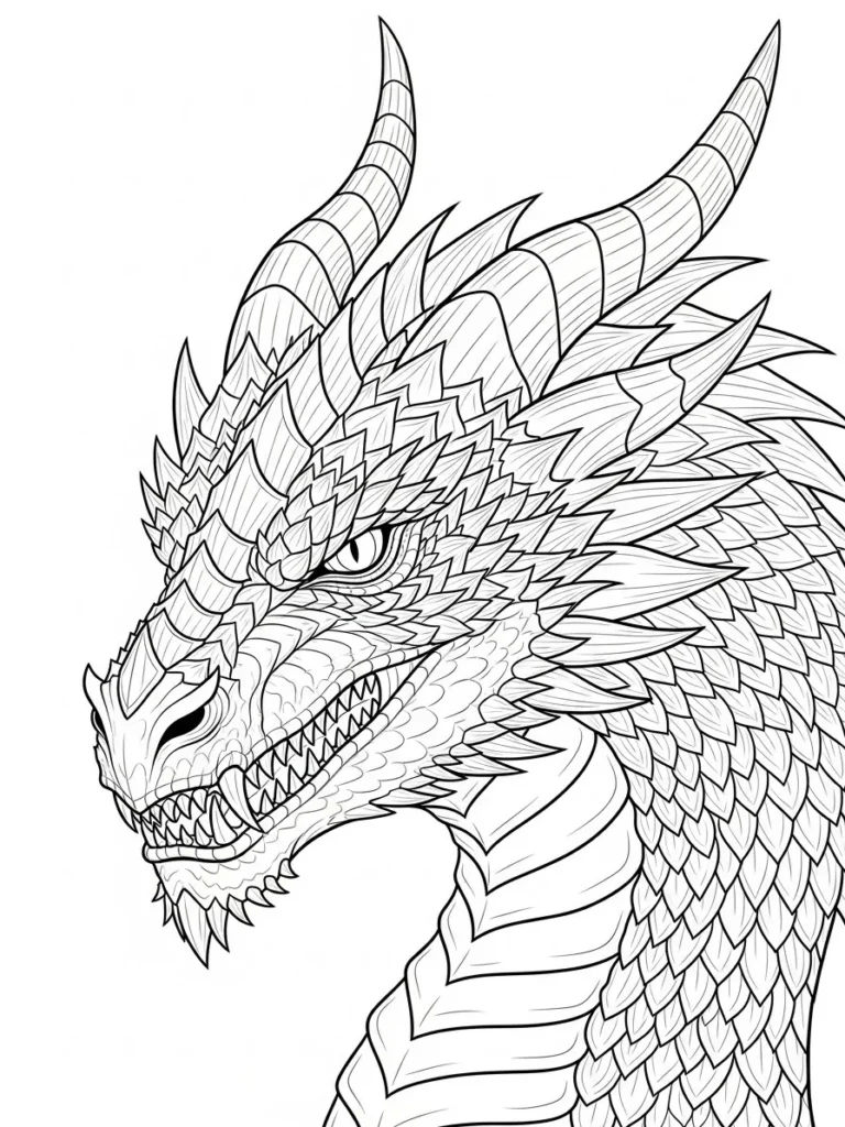 This coloring page focuses on a bold close up dragon portrait filled with sharp detail and dramatic texture. The dragon head is turned slightly to the side showing off long curved horns jagged scales and a powerful jaw lined with pointed teeth. Layered scale patterns flow across the face neck and crest creating a striking sense of depth and movement. The line work is clean and fine with plenty of repetition in the scales which makes the design feel intense and richly detailed while still leaving room to play with shading and color choices.