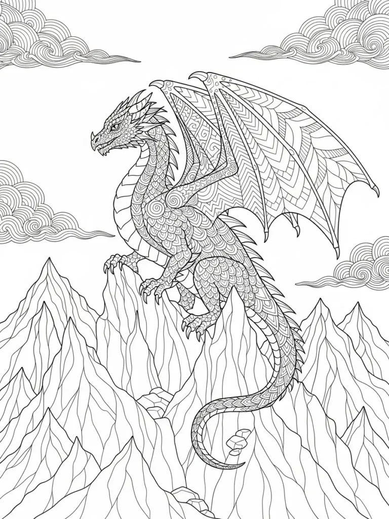This coloring page shows a majestic dragon perched high among jagged mountain peaks with its wings lifted and ready for flight. The dragon body is covered in layered scale patterns that flow naturally from head to tail while the wings are filled with bold geometric and zigzag designs that add visual rhythm. Soft swirling clouds float around the dragon and balance the sharp angles of the mountains below. The line work is crisp and detailed with plenty of intricate sections mixed with open areas in the sky and rock formations to keep the layout feeling spacious and dramatic.
