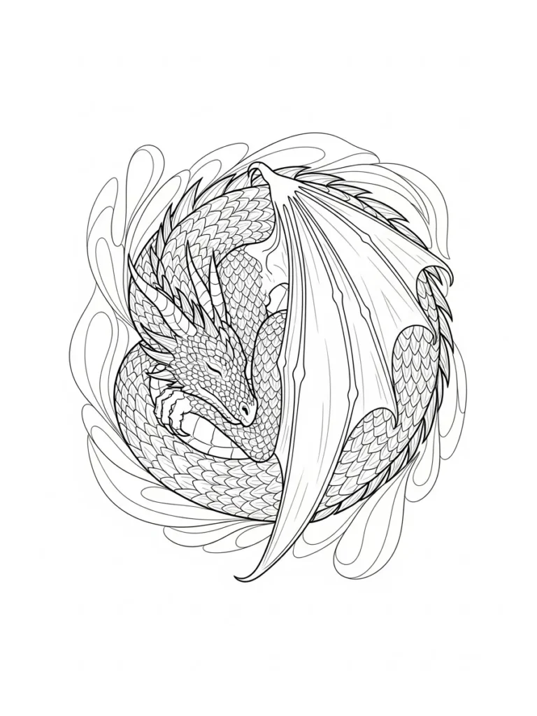 This coloring page features a curled dragon resting peacefully with its wings wrapped closely around its body like a protective cocoon. The design is circular and balanced with flowing lines that guide the eye around the dragon’s form. Layered scales cover the body and neck while the wings add smooth curved sections that contrast beautifully with the textured details beneath. Soft swirling shapes surround the dragon and give the whole piece a dreamy calm feeling. The line work is clean and fine with lots of repetition that feels detailed but not overwhelming.