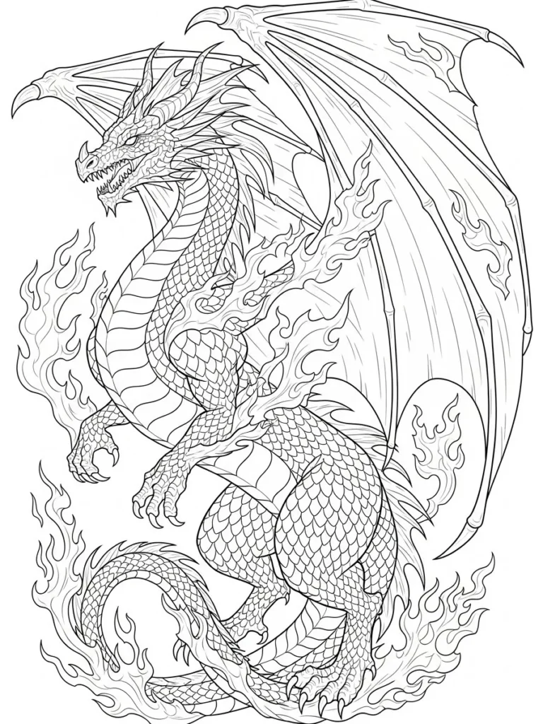 This coloring page showcases a fierce dragon standing tall with massive wings spread wide and flames curling around its body and tail. The dragon is packed with sharp scale details along the chest legs and neck while the wings feature long clean sections that contrast beautifully with the busy textures below. Flowing flame motifs weave through the design adding movement and intensity without overcrowding the page. The line work is crisp and fine which makes every scale flame and wing panel feel intentional and satisfying to color.