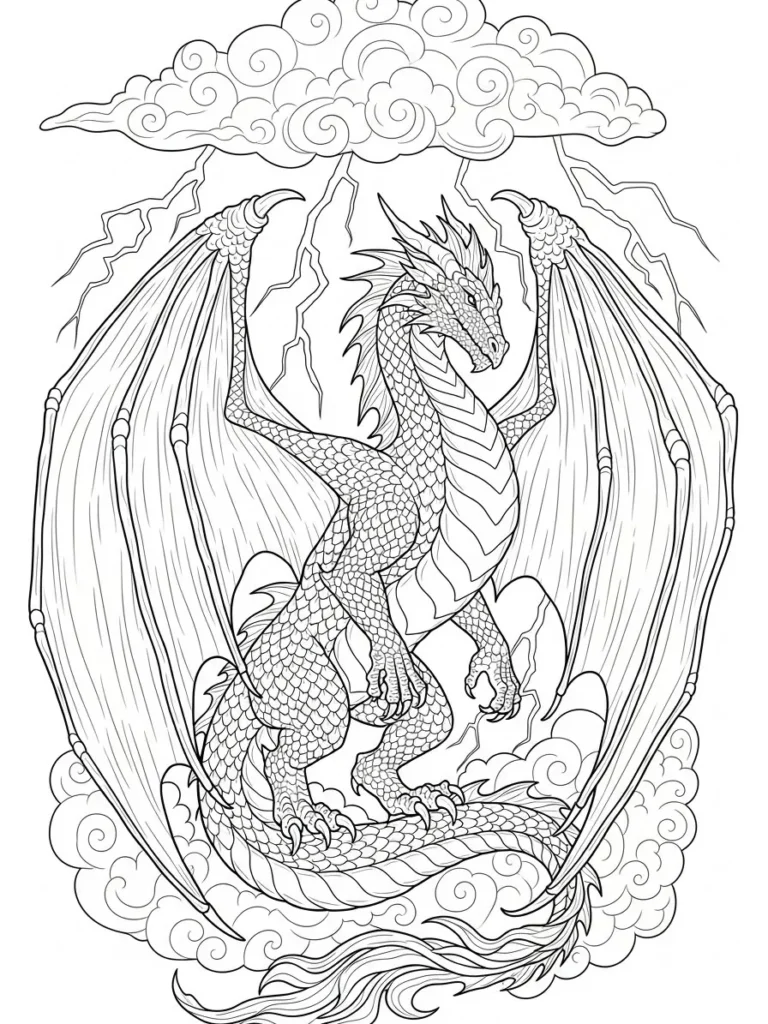 This coloring page features a commanding dragon standing tall among swirling clouds with lightning cracking through the sky above. The dragon’s wings are spread wide and filled with long flowing sections that contrast beautifully with the layered scales covering its body and tail. Curved cloud shapes frame the scene and create a dramatic circular flow around the dragon while jagged lightning bolts add energy and movement. The line work is clean and precise with a mix of detailed textures and open spaces that keep the design bold without feeling too crowded.