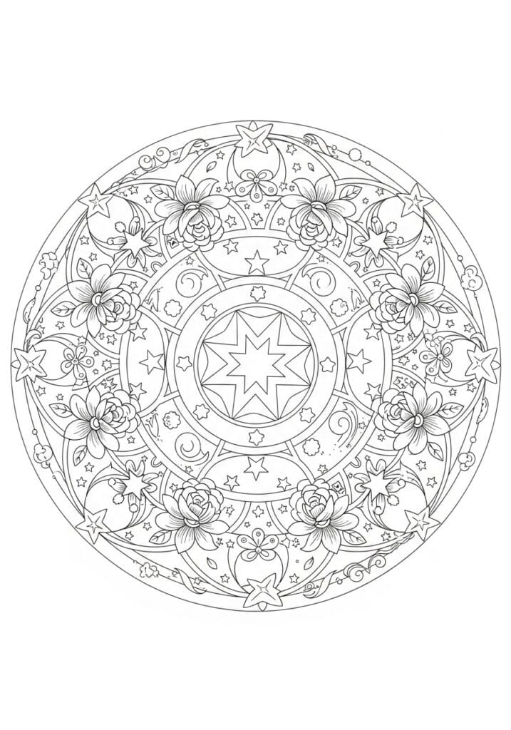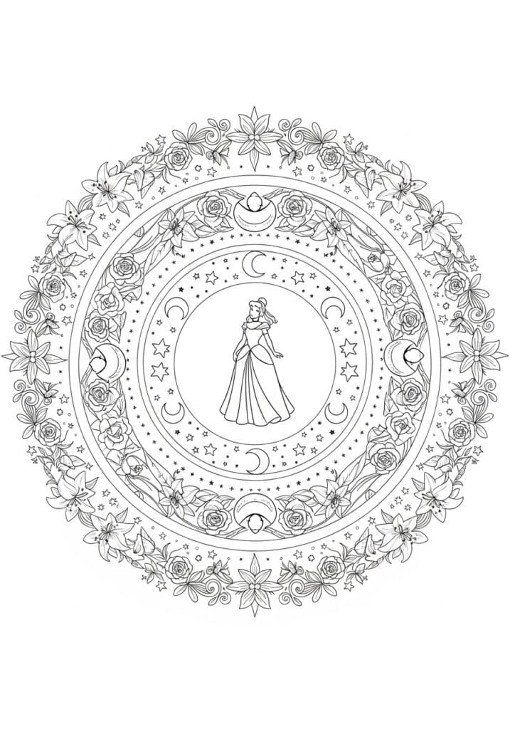 This stunning mandala design features a graceful princess standing at the very center, surrounded by concentric rings filled with crescent moons, scattered stars, and tiny dots that create the most magical night sky feel. Moving outward, the rings get more and more detailed until you hit the gorgeous outer border, which is absolutely packed with blooming roses, elegant lilies, swirling vines, and decorative flourishes. The line work is clean and confident throughout, with a nice mix of thicker outlines on the main elements and super fine detail lines inside the florals and celestial motifs. The overall layout is beautifully balanced and symmetrical, giving it that satisfying mandala energy while still feeling whimsical and fairy tale inspired.