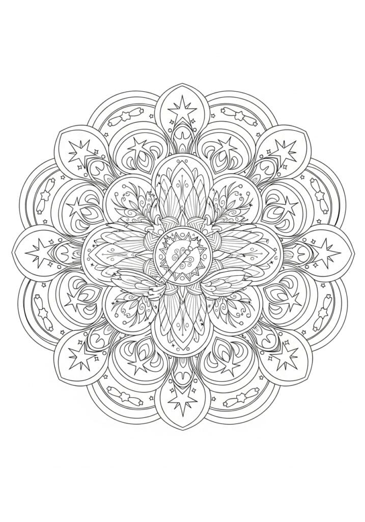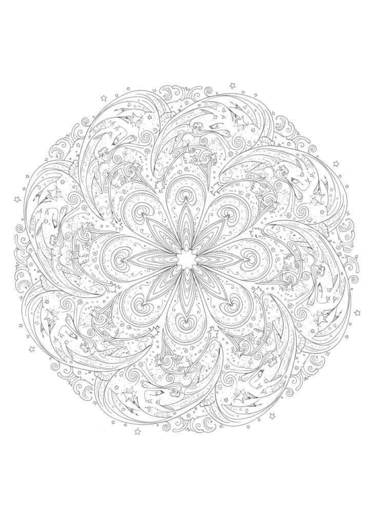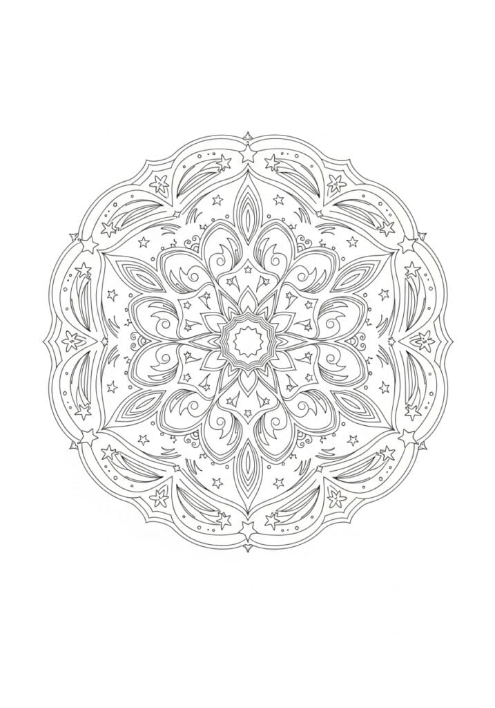This one is all about layers and movement. The design radiates outward from a detailed lotus-style center packed with fine feathery petals, tiny swirling tendrils, and delicate leaf shapes that give it a really organic, almost magical feel. From there it expands into bold petal-shaped sections filled with flowing curls and soft curves, and the outer ring is made up of large rounded pods each containing a starburst or multi-pointed star. Scattered throughout are tiny stars, little capsule shapes, and crescent details that add so much personality without making the whole thing feel overwhelming. The line work is confident and clean, with thicker outlines holding the big shapes together and finer lines doing all the beautiful detail work inside each section.