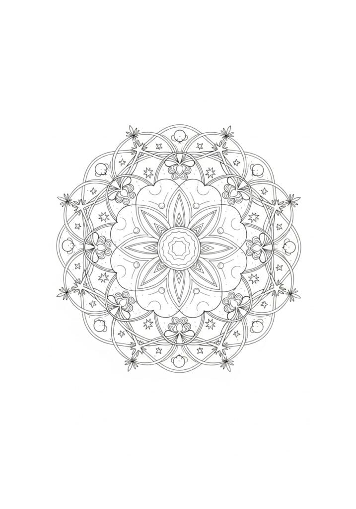 This design has a beautifully meditative and almost cosmic quality to it, rooted in the kind of sacred geometry patterns that feel timeless and deeply satisfying to look at. The foundation is built from a series of overlapping and interlocking circles that create a flower of life style structure, with elegant pointed petal shapes emerging from the intersections and a concentrically ringed center that draws the eye inward in the most hypnotic way. At each point where the outer circles meet, small decorative flower buds and bold eight-pointed starburst shapes punctuate the design with lovely regularity, while tiny scattered stars and small circle details fill the spaces in between with just enough visual interest to keep things engaging. The outer boundary forms a soft scalloped edge from the overlapping circles, giving the whole design a gentle and organic finish. Line weights are light and consistently fine throughout, lending the page a delicate and almost etched quality.