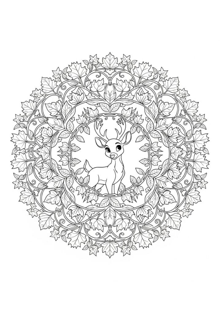This design has the most wonderful woodland atmosphere, and the level of leaf detail packed into it is genuinely impressive. A sweet young stag stands proudly at the center, antlers reaching upward and blending almost seamlessly into the dense foliage surrounding him, his big expressive eyes giving him that gentle Disney deer energy that is just impossible to resist. The entire outer section of the mandala is filled with endlessly repeating maple leaves of all sizes, connected by elegant curling vine scrollwork that winds through the whole composition in a beautifully symmetrical pattern. Tiny berry clusters and small star shapes are dotted throughout the leaf border, adding little moments of variety and charm. The line work is bold and well defined on the stag and the larger leaf shapes, with finer detail lines inside each individual leaf showing off the veining and giving the whole page a really satisfying sense of texture and depth.