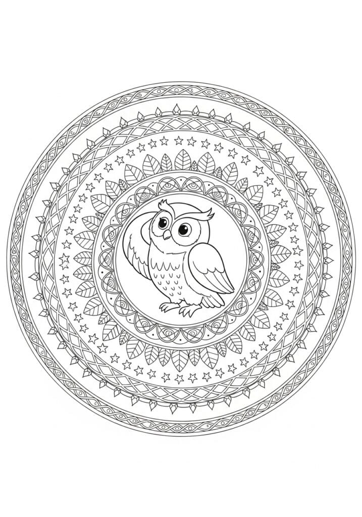 • A Wide-Eyed Owl Mandala With Stars and Woven Borders