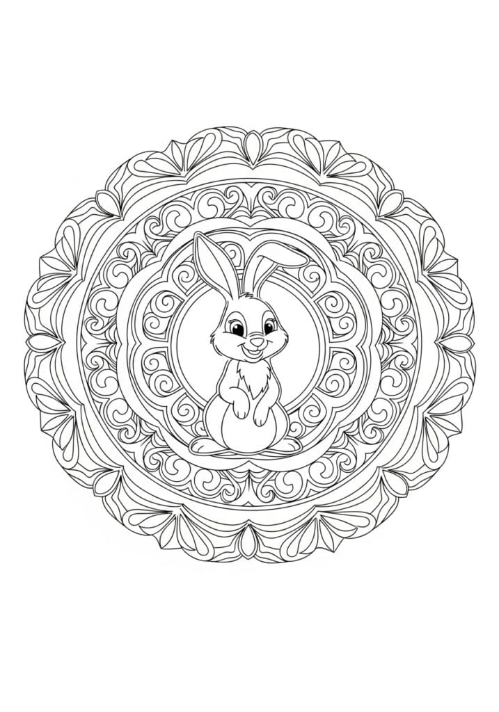 A Fluffy Bunny Mandala Framed in Scrolls and Petal Borders