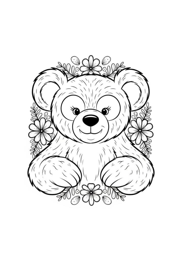 This one is a little different from the more traditional mandala layouts in this collection, and honestly that is exactly what makes it so charming. Rather than a circular repeating pattern, this design is centered around a big adorable teddy bear portrait that fills most of the page, rendered with fine short fur texture lines all over the body that give it a wonderfully soft and cuddly feel. The bear has the sweetest eyelashed eyes and a happy little smile, and the whole face is done with confident bold outlines that make it feel both polished and approachable. Scattered around the bear at the top, sides, and bottom are clusters of simple open daisy-style flowers with petite rounded petals and tiny leaf sprigs, arranged in a loose symmetrical way that nods gently to the mandala format without being rigid about it. The overall composition is soft and rounded, almost like a decorable sticker or keepsake design.