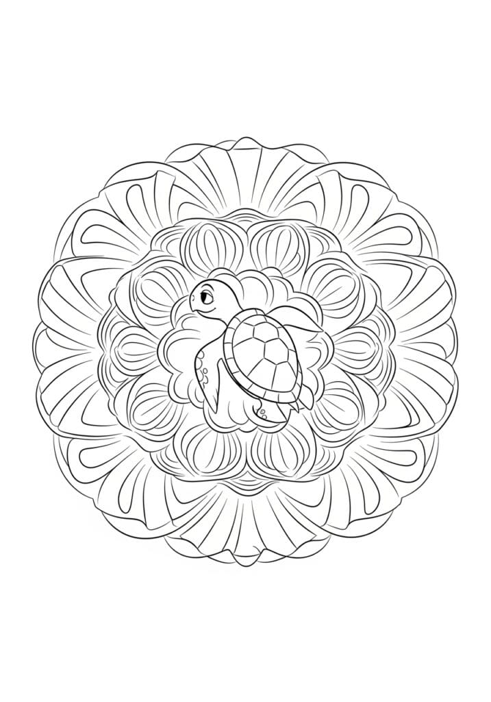 This design has the most wonderfully hypnotic and flowing quality to it, built almost entirely from layers and layers of long curved petal shapes that ripple outward from the center like the petals of a giant dahlia or the gentle movement of ocean waves. A tiny baby sea turtle peeks out from the very heart of the design, its little geometric shell pattern and curious expression making it impossibly sweet against the swirling organic forms surrounding it. The petal layers are rendered with fine parallel lines running along their length that create a beautiful sense of depth and texture, and each layer slightly overlaps the next to build up this really satisfying sense of dimension across the whole page. There are no hard geometric sections here at all, just continuous flowing curves from the center all the way to the ruffled scalloped outer edge, which gives the whole design a uniquely soft and organic feel compared to more structured mandalas.