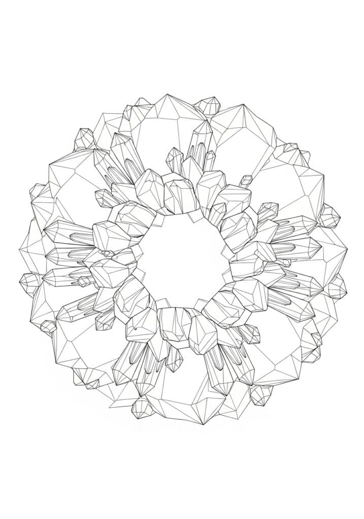 This design is unlike anything else in this collection and if you are even slightly into crystals and gemstones, it is going to stop you in your tracks. The entire page is made up of a circular wreath of incredibly detailed crystal formations, with pointed quartz-style clusters, chunky raw gemstone shapes, and faceted mineral forms all packed together in a dense and endlessly fascinating ring. The center is left as a clean open hexagonal space which creates a beautiful negative space focal point and makes the surrounding crystal ring feel even more dramatic and abundant by contrast. Every individual crystal is drawn with precise angular facet lines that give each one a realistic three-dimensional quality, and the variety of shapes and sizes throughout means no two sections of the ring look exactly the same. Line weights are consistently fine and clean throughout, which suits the sharp geometric nature of the crystal forms perfectly.