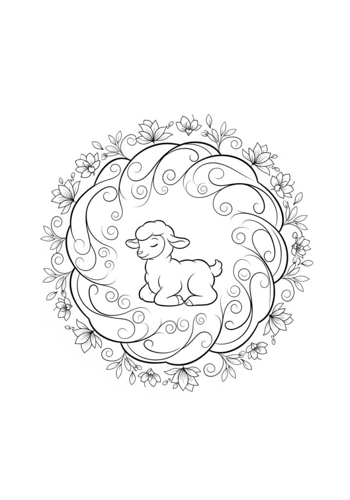 This design is so tender and serene that it almost feels like a lullaby in coloring page form. A tiny fluffy lamb rests peacefully at the center, legs tucked under its body and eyes gently closed, nestled inside a beautifully flowing inner frame made up of large bold swirling scroll shapes that curve and wrap around the little animal like a soft protective cradle. Fine delicate tendrils and smaller curling spirals fill the spaces between the main scroll forms, adding a lovely airy and whimsical quality to the inner section. The outer border is a loose and organic wreath of elegant flowers, pointed buds, and leafy sprigs arranged all the way around the circle, keeping the whole composition feeling fresh and garden inspired. The line work is wonderfully light and graceful throughout, with confident outlines on the lamb and main scroll shapes and beautifully fine lines on the floral border and smaller decorative details.