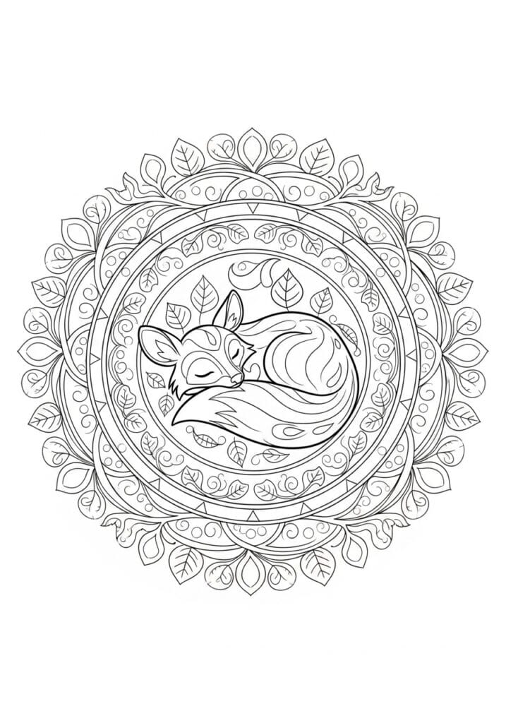A Sleeping Fox Mandala With Leaves and Forest Charm