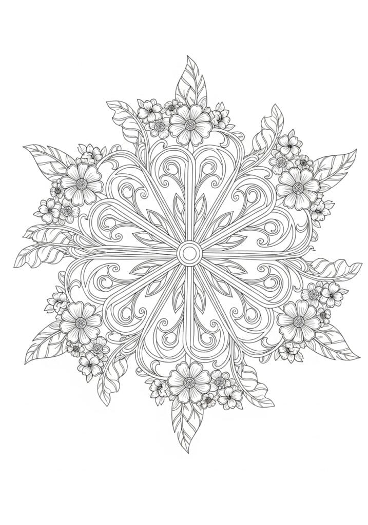 This design has such a fresh and airy feel to it, which makes it stand out from the more traditional circular mandala layouts. Instead of a round shape, this one spreads out like a snowflake or a decorative compass star, with four long pointed arms extending outward and each one tipped with a striped leaf. The inner structure is built from flowing ribbon-like lines and elegant swirls that curve and loop around a tiny circle center, creating this really gorgeous filigree effect that almost looks like ironwork or lace. Then at each of the four diagonal corners, lush clusters of open-faced flowers and leafy sprigs burst outward, adding a wonderfully organic and garden-fresh energy to the whole composition. The line work is smooth and consistent throughout, with medium weight outlines and plenty of fine detail inside the petals and swirl sections.