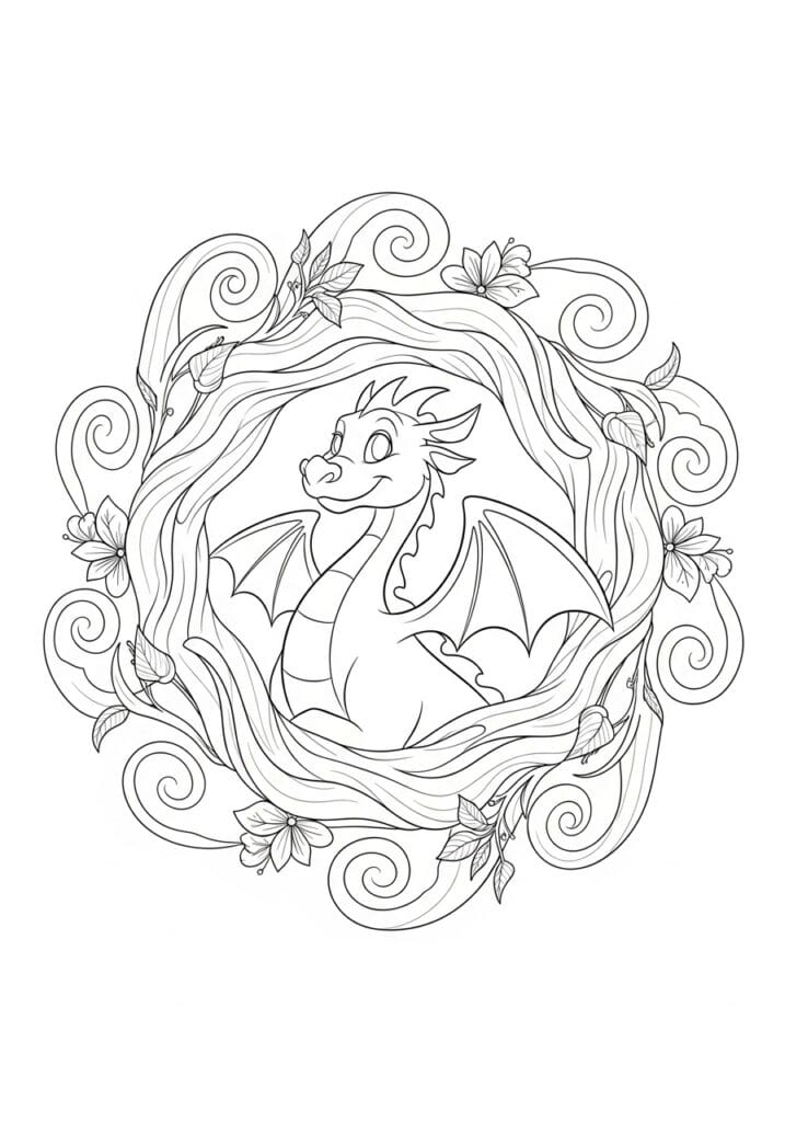 • A Baby Dragon Mandala Nestled in Swirls and Blooms