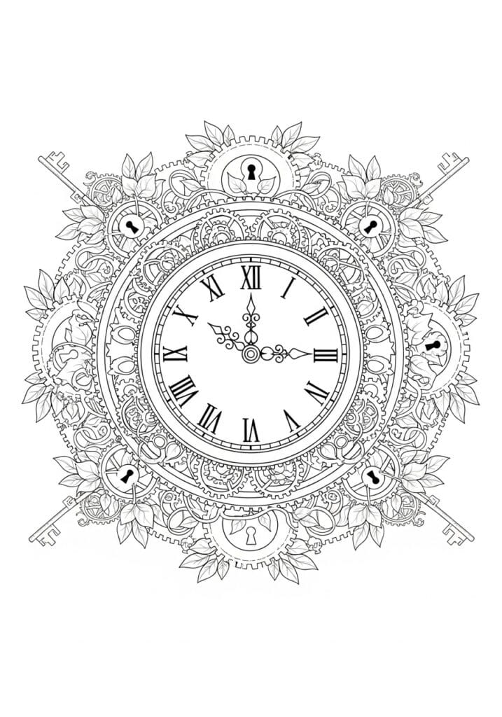 This design is such a cool and unexpected twist in a collection of dreamy mandala pages. At the center sits a large ornate clock face with Roman numerals and beautifully detailed filigree hands pointing to just before midnight, giving the whole thing this delicious fairytale urgency. Surrounding the clock face is a dense ring of interlocking gears and cogs of all sizes, tangled up with trailing leafy vines that weave through all the mechanical parts in the most charming way. Scattered throughout the outer sections are small keyhole shapes and at the four diagonal corners, pairs of crossed antique skeleton keys extend outward like decorative arms. The line work is bold and detailed with strong confident outlines on the gears and clock elements and finer lines handling the leaf veins and decorative inner details, making the whole page feel rich and substantial.