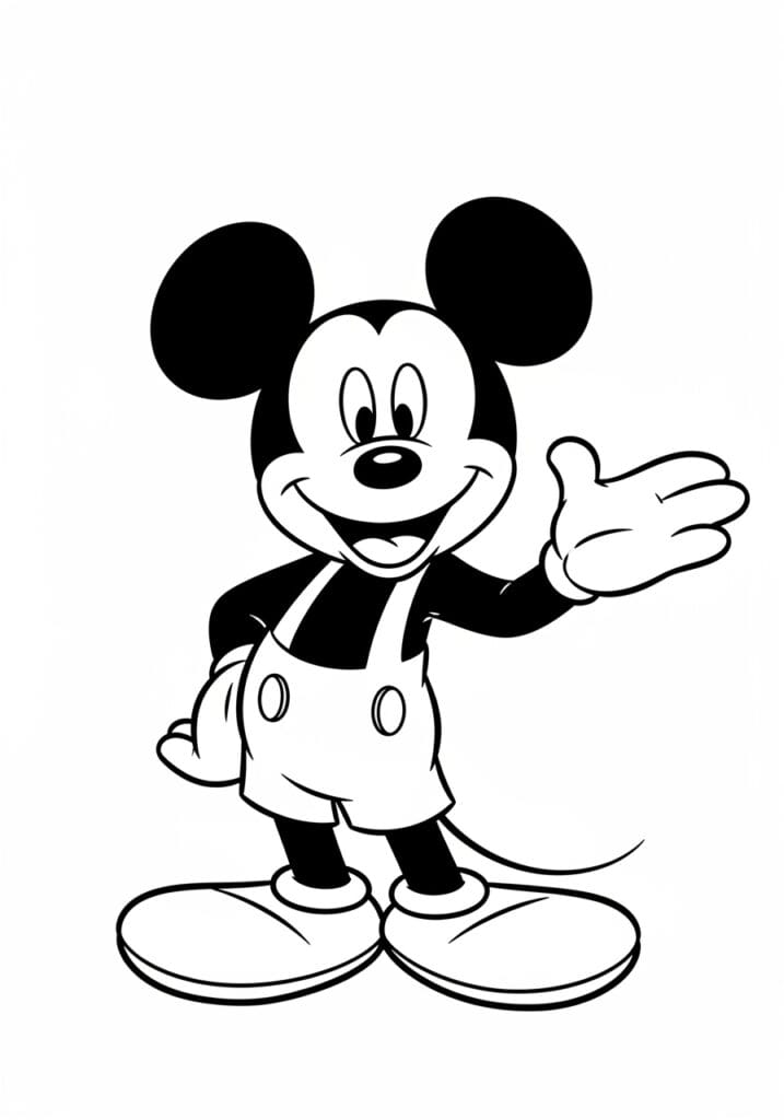 This coloring page features the one and only Mickey Mouse in his classic pose, one hand extended in a cheerful wave and the other resting by his side. He’s dressed in his iconic shorts with two round buttons and his signature oversized shoes. The lines are bold and clean, making every section super easy to identify and fill in. The layout is simple with Mickey centered on the page and plenty of white space around him, so it never feels cluttered or overwhelming.