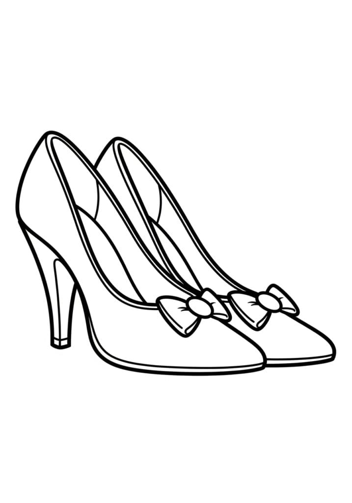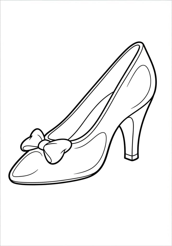 This coloring page showcases an elegant pointed-toe high heel shoe with a sweet little bow detail sitting right at the toe, instantly recognizable as Cinderella’s iconic glass slipper. The design is beautifully simple with smooth, flowing lines capturing the classic silhouette of the shoe, a sleek stiletto heel, and a few subtle curved lines along the inner sole to suggest the shape and shine of glass. The outlines are bold and well-defined throughout, while lighter interior lines add just enough dimension to make the shoe look polished and graceful. The whole design is positioned at a lovely diagonal angle across the page, giving it an elegant almost fashion-illustration kind of feel.