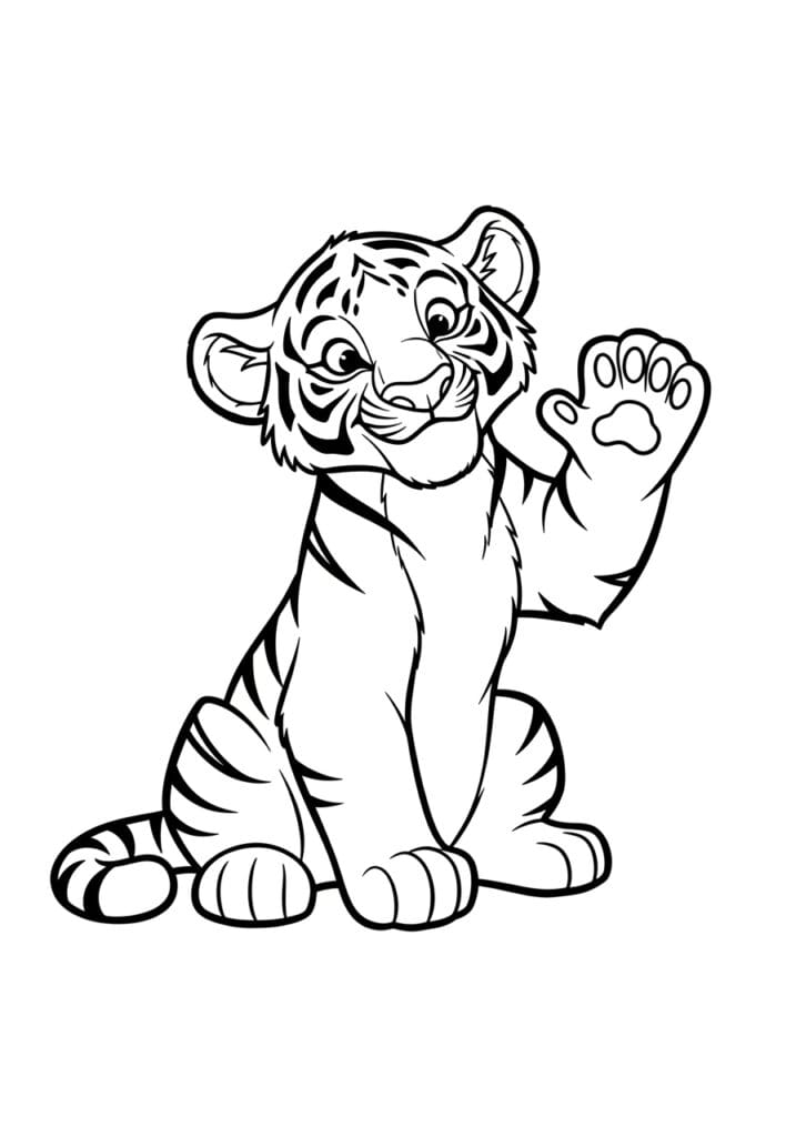 This coloring page features the most charming little tiger cub sitting down and holding one big fluffy paw up in a cheerful wave, with a cheeky grin spread across his face. The design is packed with gorgeous stripe details running across his face, body, legs, and tail, giving this page a really satisfying amount of pattern work to color through. The lines are bold and well-defined throughout, with slightly softer strokes used for the fur texture around his cheeks and chest. The raised paw showing off his little toe beans is such a sweet focal point, and the overall composition feels lively and full of personality.