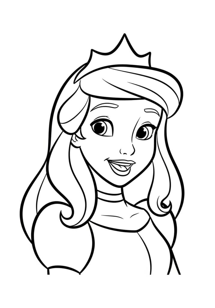 This coloring page is a close-up portrait of a beautiful Disney princess wearing a sparkling pointed crown, with long wavy hair flowing softly around her face and a bright happy smile that fills the whole page with warmth. The focus is entirely on her face and hair, making this a wonderfully intimate and detail-friendly design that feels almost like a mini art project. The lines are smooth and confident, with thicker strokes defining the hair, crown, and facial features, and softer lighter lines capturing the gentle waves and curls in her long locks. The cropped portrait layout is a lovely change of pace from full-body designs and really lets you focus on getting the face and hair just right.