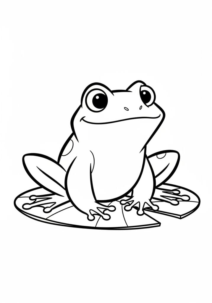 This coloring page shows a round and cheerful cartoon frog perched right in the middle of a flat lily pad, gazing upward with big round eyes and a subtle little smile that gives him loads of personality. His body is beautifully simple with large smooth sections making up his head and torso, while his webbed feet and toes add some lovely fine detail down at the bottom of the page. The lily pad underneath him has a classic notched shape with thin vein lines radiating outward, giving a nice natural texture to the base of the design. The outlines are thick and clean throughout, with just a handful of smaller detail lines to keep things interesting without overcomplicating anything.