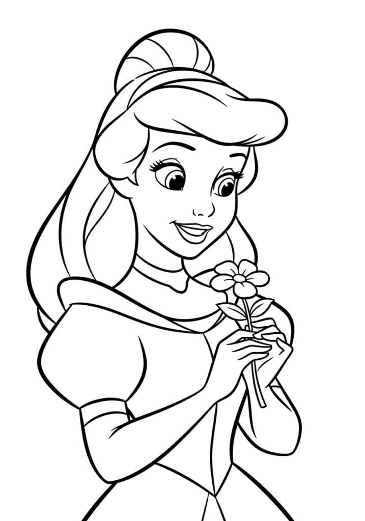 This coloring page features Cinderella in a beautiful half-portrait pose, her iconic swept-up hairstyle sitting perfectly on top of her head as she smiles warmly and holds a delicate little flower with both hands. Her off-the-shoulder dress shows just enough of her gown to give you something lovely to color, and the small simple flower with its rounded petals and tiny leaves adds the sweetest finishing touch to the whole composition. The lines are smooth and elegantly drawn throughout, with bold clean outlines defining her hair, face, and dress, and finer lighter strokes adding detail to her facial features and the flower petals. The overall layout feels warm and intimate, like a little snapshot of a happy princess moment.