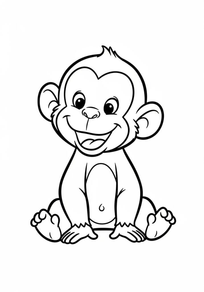 This coloring page features the most joyful little baby monkey sitting down with his legs splayed out in front of him and a huge open smile that takes up half his face, giving him absolutely loads of cheeky personality. His face has that classic monkey two-tone look with a lighter muzzle area contrasting against the rest of his head, and his round ears stick out on either side in the most endearing way. The design uses nice thick clean outlines throughout, with softer wispy lines at the wrists and ankles to suggest a little fur texture. The overall layout is beautifully simple and centered, with large open sections across his body that make this one of the most beginner-friendly pages in the collection.