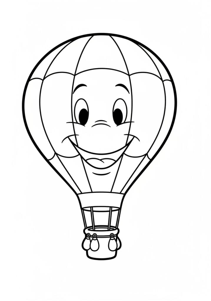 I find this page so unexpectedly fun to color because those vertical panels are just perfect for a color pattern. You can alternate two colors all the way around for a classic striped look, or use a whole rainbow of shades for something really bright and celebratory. I always enjoy giving the face a go too because deciding on eye color and cheek tones on something as silly as a balloon face is just the most joyful little creative decision. The basket is a great finishing element as well since the grid texture looks really satisfying once it is filled in. This one is pure feel-good coloring energy from top to bottom.