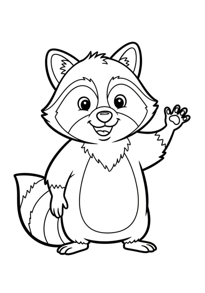 This coloring page features an absolutely delightful cartoon raccoon standing upright and giving a cheerful wave with one little paw raised high, showing off those cute individual toe pads in the most charming way. His face has that classic raccoon mask pattern with darker patches framing his bright eyes, and his fluffy chest fur is suggested with lovely wispy lines that give him a really cozy and full appearance. His striped tail curves around behind him adding a great sense of depth and balance to the whole composition, and the bold clean outlines throughout make every section of fur, face, and body really easy to identify and fill in. The overall design has a wonderful warm woodland character feel that is just incredibly likeable.