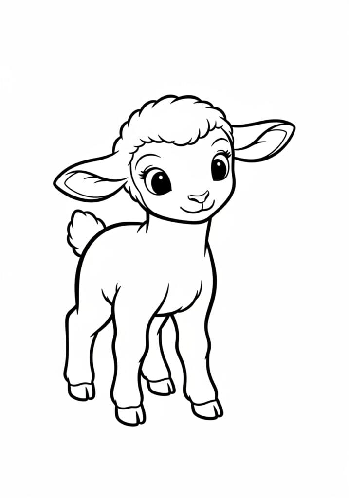 This coloring page features an utterly adorable baby lamb standing in a gentle three-quarter pose with the most innocent wide eyes and a soft little smile that is honestly too precious for words. The top of her head is covered in a cloud of fluffy curly wool rendered with lovely soft rounded lines, while her body, legs, and face are smooth and open with clean bold outlines that make every section really easy to work with. A tiny fluffy tail pokes out at the back adding the most endearing finishing detail, and her neat little hooves ground the design with some darker defined sections at the bottom. The overall layout is beautifully simple and uncluttered, with the lamb centered on a clean white background and plenty of open space to make this one of the most beginner-friendly pages in the whole collection.