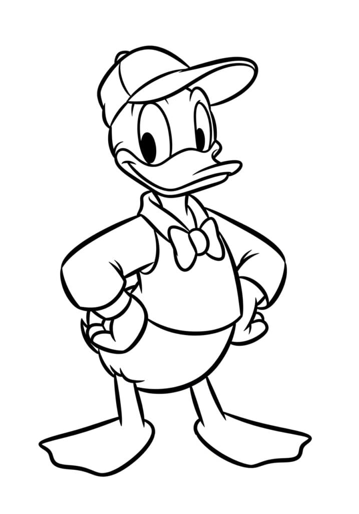 This coloring page shows Donald Duck in full attitude mode, standing with both hands on his hips and that signature grumpy-but-lovable expression on his face. He’s wearing his classic sailor-style top with a cute bow tie, his beloved cap sitting on top of his head, and his big flat duck feet planted firmly on the ground. The lines are thick and confident throughout, making each section really clear and easy to fill in. The whole design is nicely centered with a clean open background, so there’s nothing distracting from Donald’s very dramatic energy.