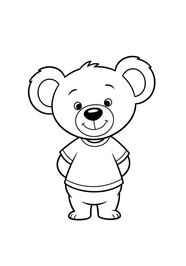 This adorable coloring page features a chubby little bear cub standing upright with the sweetest smile on his face. He’s dressed in a simple casual t-shirt with striped cuffs and matching shorts, giving him the most endearing everyday look. The design uses nice thick outlines throughout with slightly softer, fluffier lines around the ears and the top of his head to give that cozy teddy bear texture. The layout is beautifully simple with the little guy centered on a clean white background, and the large open sections make this one of the easiest pages to color in the whole collection.