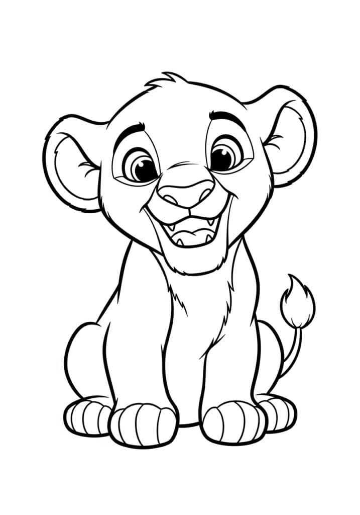 This coloring page shows a young Simba sitting down with the biggest, goofiest grin you have ever seen, and honestly it is impossible not to smile right back at him. His face takes up a good portion of the page which makes all those expressive features really easy to work with. The lines are bold and clean around the main body outline, with softer and slightly scratchier strokes used around the ears, chin and chest to suggest that baby fur texture. Little details like his chunky striped paws, the tiny tuft on his tail, and his bright wide eyes give the design just enough character without making it complicated to color.