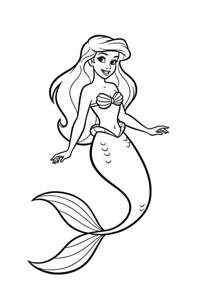 This coloring page shows Ariel in her full mermaid form, floating gracefully with her long wavy hair flowing all around her and that signature happy expression on her face. She’s wearing her iconic shell top and her beautiful tail curves elegantly down the page, ending in a delicate fan-shaped fin with lovely lined details inside it. A few small scale shapes are dotted along the upper tail area, and the overall composition has a wonderful flowing diagonal energy that makes the whole design feel like she really is moving through the water. The lines are bold and confident throughout, with thinner strokes used inside the fin and hair to add gentle texture and movement.