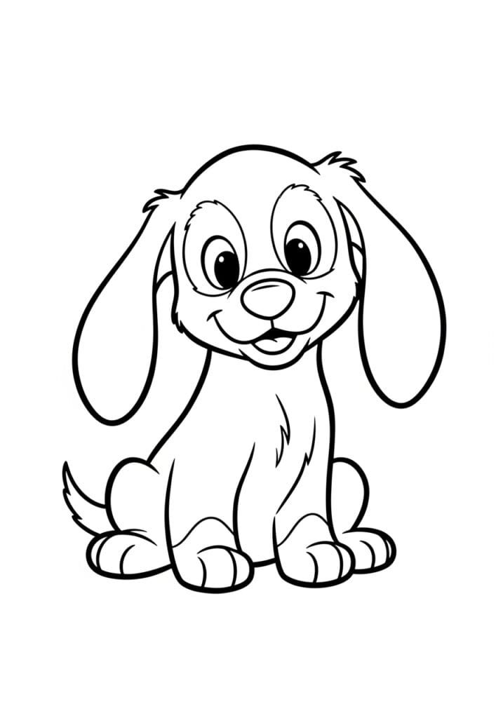 This coloring page features the most irresistibly cute cartoon puppy sitting front and center with a big open smile and oversized floppy ears that hang down past his shoulders. His body is rounded and chubby in that classic cartoon style, with soft wispy lines along his chest, cheeks, and the top of his head to hint at fluffy fur. The outlines are thick and sturdy all the way through, and smaller details like his little curled tail, chunky paws, and expressive eyes add just enough personality without making anything tricky to color. The clean white background keeps all the focus on this adorable little guy.
