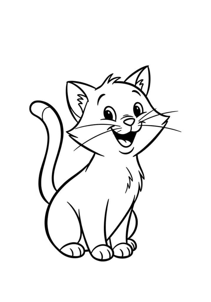 This coloring page features an adorable cartoon kitten sitting upright with its tail curling up behind it and the most gleeful open-mouthed expression on its little face. Long delicate whiskers extend out from both sides of its muzzle, pointed ears sit alert on top of its head, and soft wispy lines across the chest and inner ears give a lovely hint of fluffy fur. The outlines are bold and clear throughout the body, while the whiskers and fur texture details use thinner, lighter strokes for a nice contrast. The layout is open and airy with the kitten sitting slightly off-center, giving the whole design a playful and lively feel.