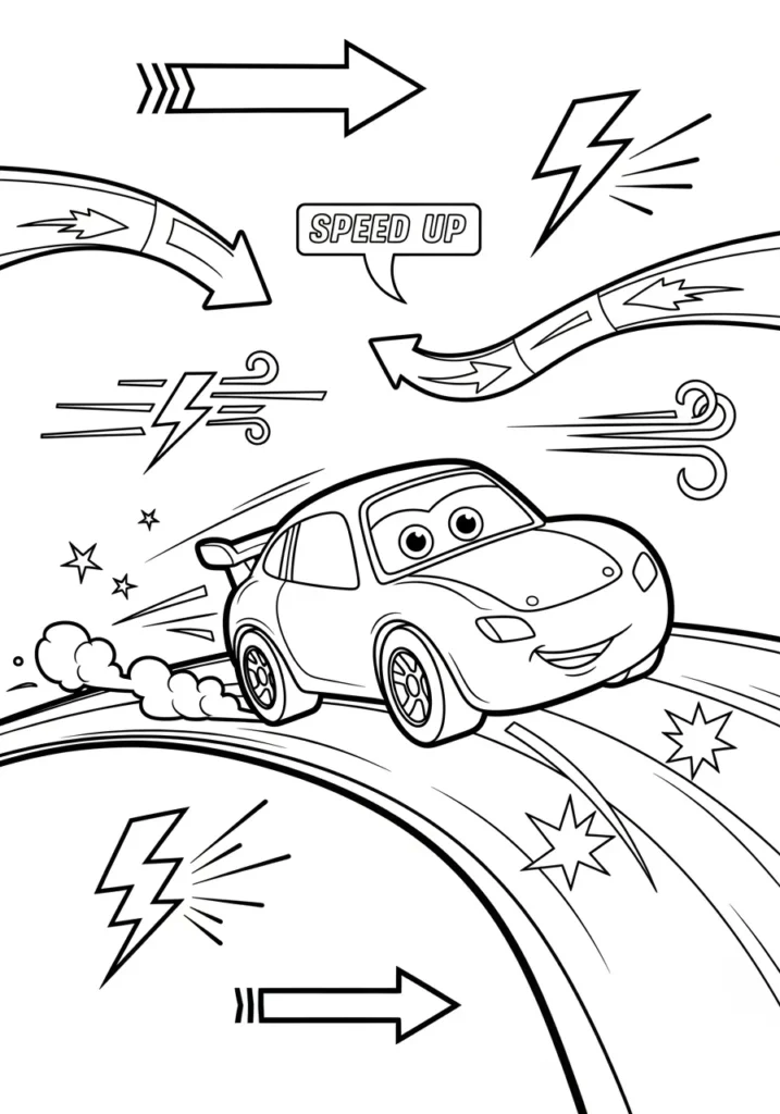 This design feels more playful with a smiling cartoon style car racing along a curved track surrounded by arrows, lightning bolts, stars, and a fun speed up speech bubble. The lines are bold and friendly, with lots of little graphic elements scattered around to keep the page lively and energetic.