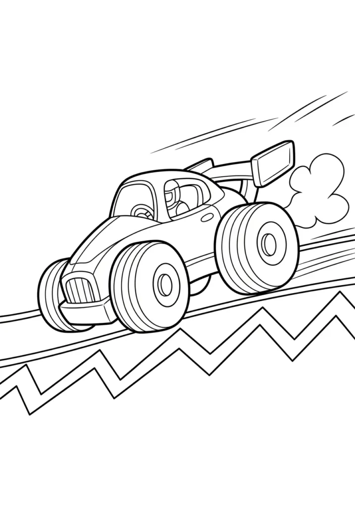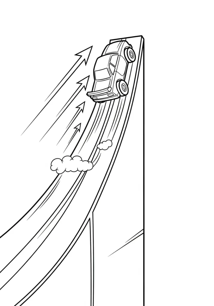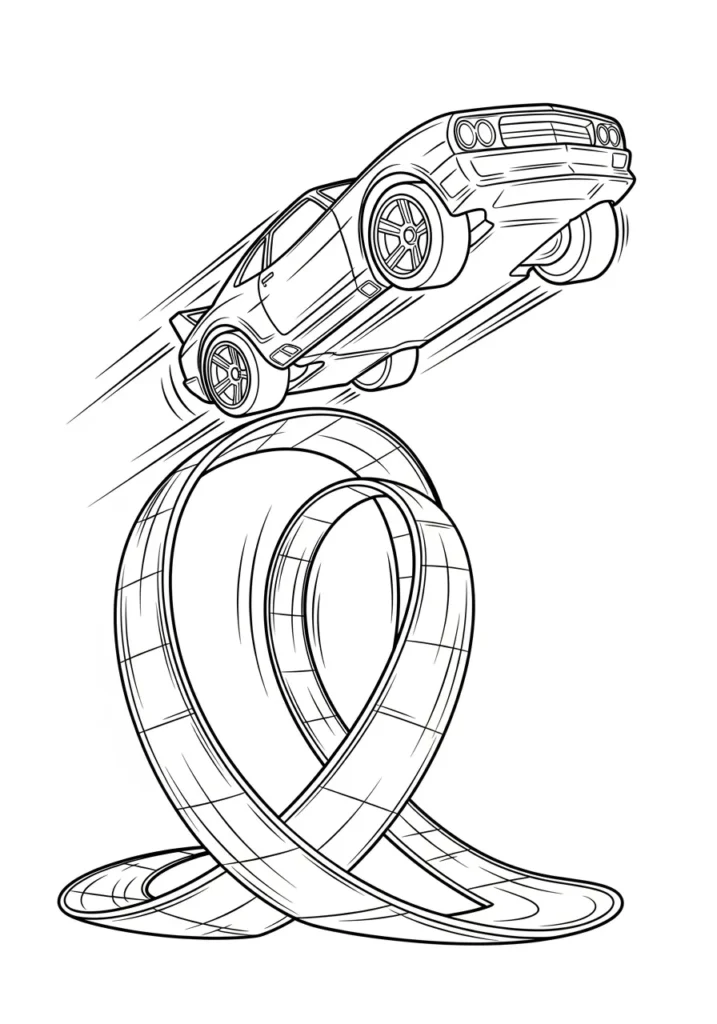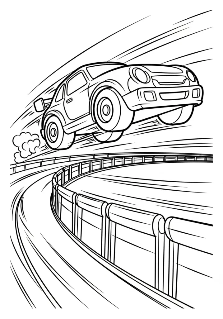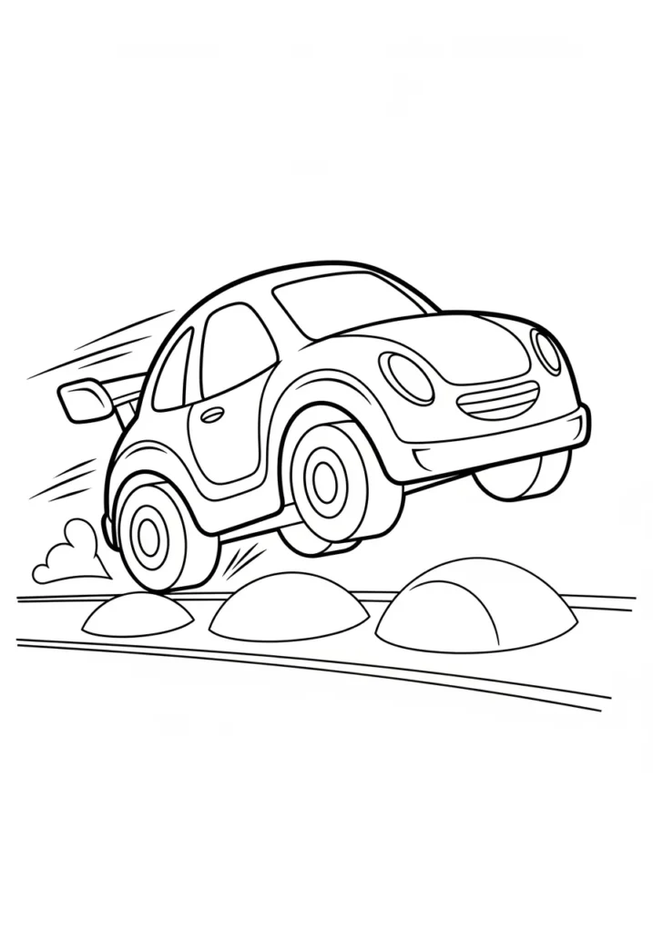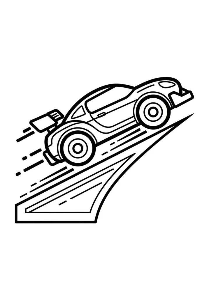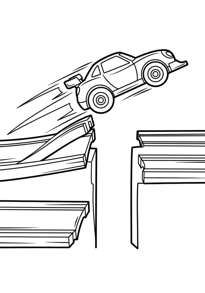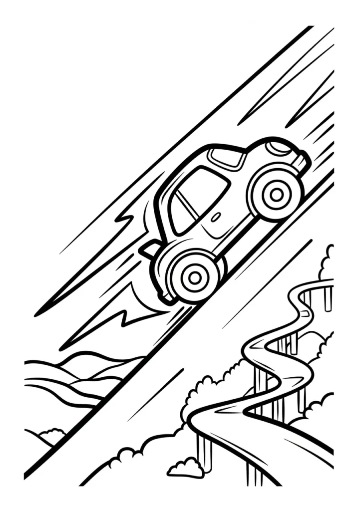 I find this page really fun because it captures that split second of excitement right before landing. Coloring the car feels rewarding since it is the clear focal point, and the open background keeps things calm and easy. It is a great balance of action and simplicity.