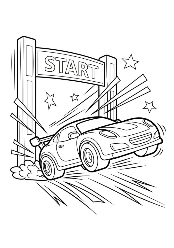 This design captures a car blasting off from a bold starting gate with stars, smoke, and sharp motion bursts all around. The contrast between the straight gate structure and the angled speed lines makes the scene feel loud and energetic. The outlines are strong and playful, perfect for bold coloring choices.