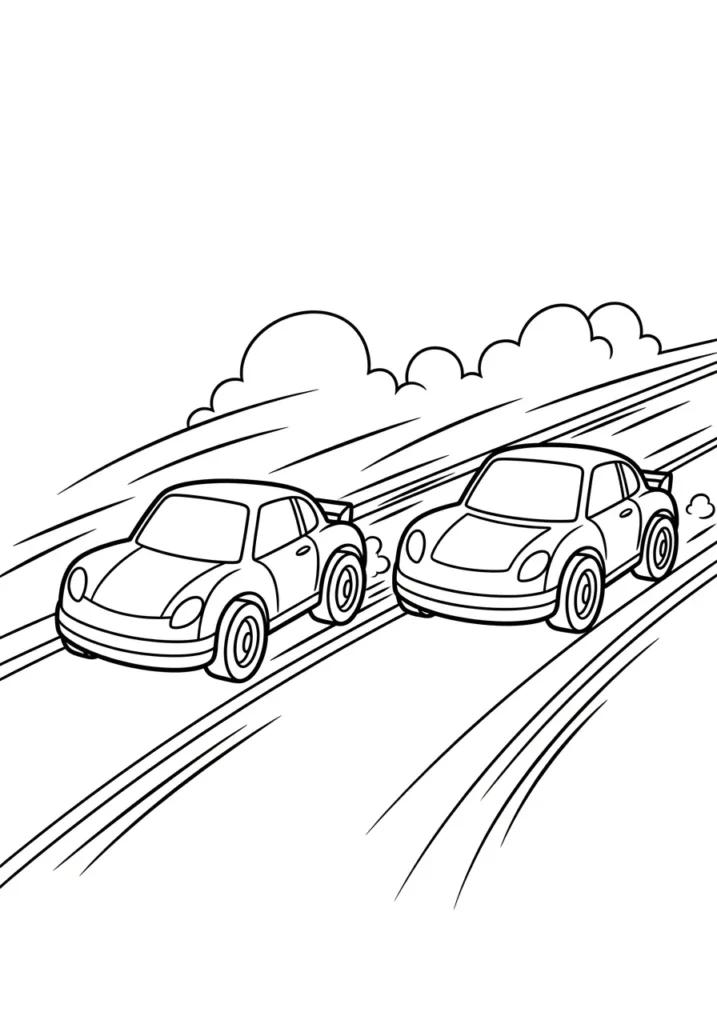 This coloring page features two sleek Hot Wheels style cars racing next to each other on a wide curved track, with flowing motion lines and soft cloud shapes in the background. The cars are evenly spaced and angled forward, giving the whole scene a smooth sense of speed without feeling chaotic. Clean bold outlines and simple details keep the layout open and balanced, making it easy to color while still feeling energetic.