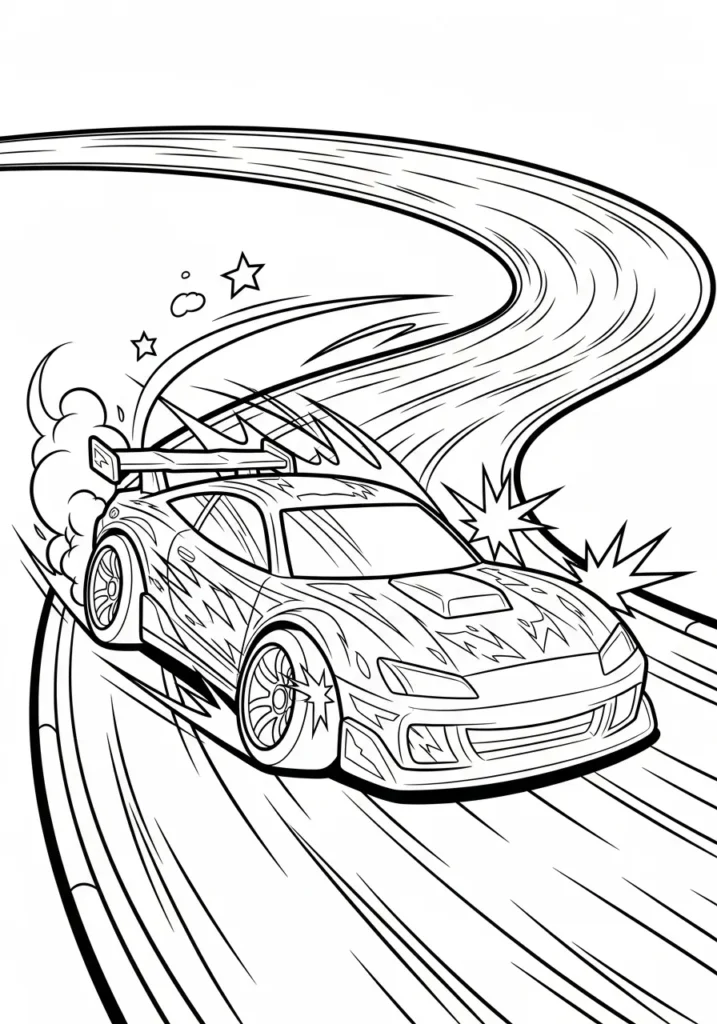 This coloring page shows a sporty Hot Wheels car drifting hard through a sweeping curved track with dramatic motion lines and starburst effects around the tires. The car design includes sharp angles, lightning style patterns, and detailed wheels that add texture without overwhelming the page. The flowing track creates a sense of speed and movement from edge to edge.