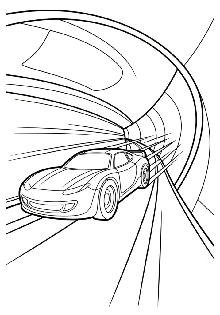 This coloring page shows a smooth sports car racing through a curved tunnel with long flowing lines that stretch toward the background. The tunnel walls and road lines pull everything forward, creating a strong sense of depth and speed. The car sits confidently in the center with clean outlines that are perfect for bold color choices.