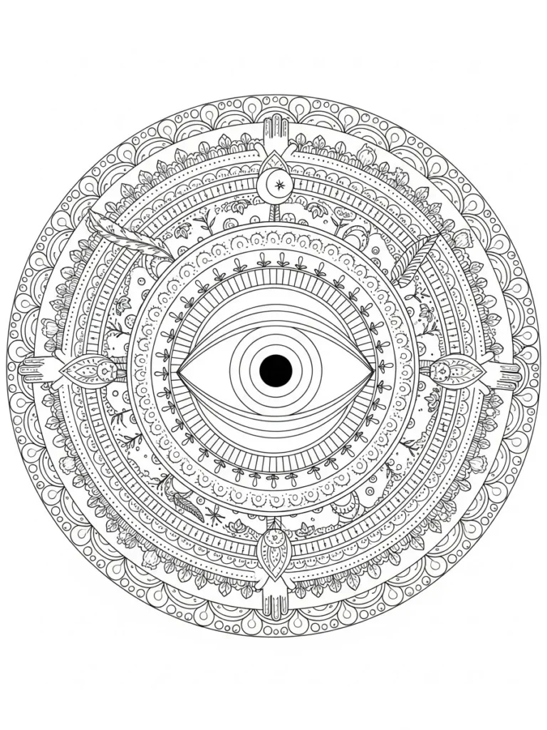 This coloring page features a beautifully detailed evil eye at the center, surrounded by layered circular mandala patterns that feel both balanced and mesmerizing. The design combines fine, clean line work with repeating motifs like leaves, feathers, hands, and small ornamental shapes that radiate outward in perfect symmetry. Each ring has its own texture and rhythm, from tiny dots and scallops to flowing lines that gently guide your eye around the page. The overall layout feels intentional and calming, with plenty of small spaces that make the design feel rich and luxurious without becoming overwhelming.