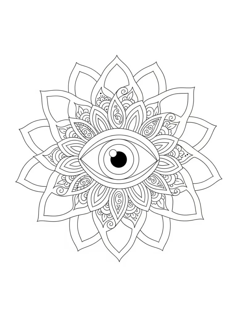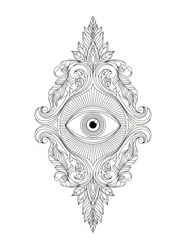 This coloring page features a striking evil eye at the center, framed by an elaborate mandala design that feels almost regal. Layered petal shapes rise above and below the eye like a decorative crown, filled with flowing curves, tiny dots, and repeating leaf inspired motifs. The line work is fine and elegant, with lots of intricate sections that create a rich, balanced layout without feeling chaotic. Everything flows outward in symmetry, giving the whole design a graceful and protective presence on the page.