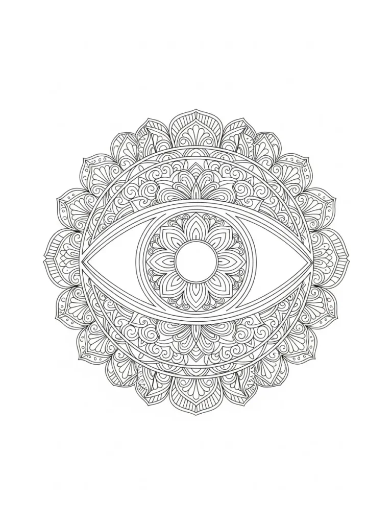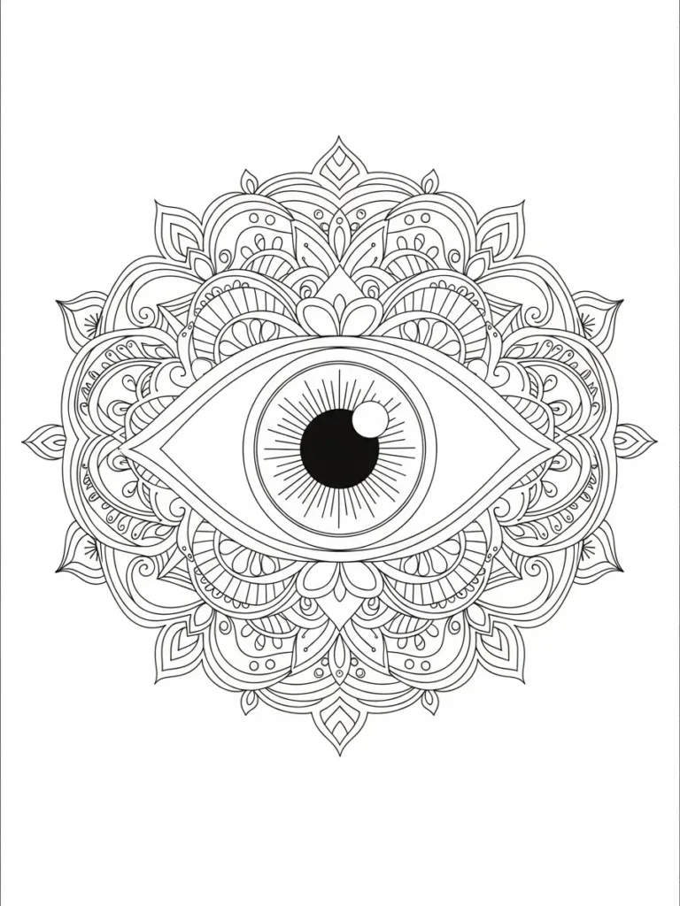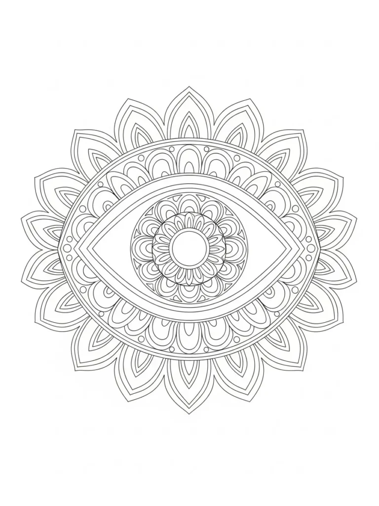 This coloring page features a graceful evil eye centered inside a layered mandala inspired by lotus petals and soft repeating curves. The eye shape is smooth and elegant, framed by multiple rings of petal like forms that radiate outward in perfect balance. Fine line details fill each section, creating a sense of movement without feeling busy. The symmetry is soothing, and the consistent line thickness keeps everything clean and easy to follow while still feeling detailed enough for adult coloring.