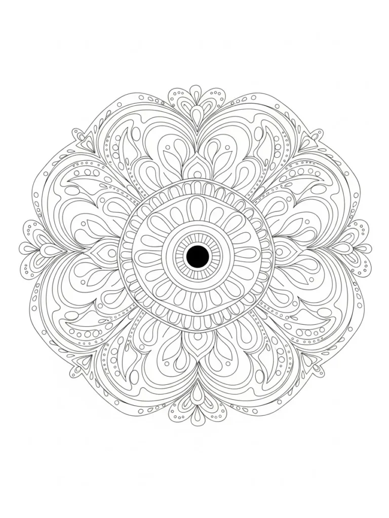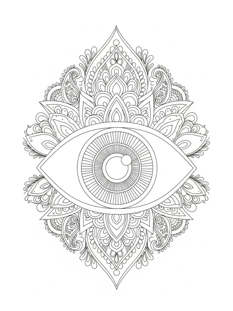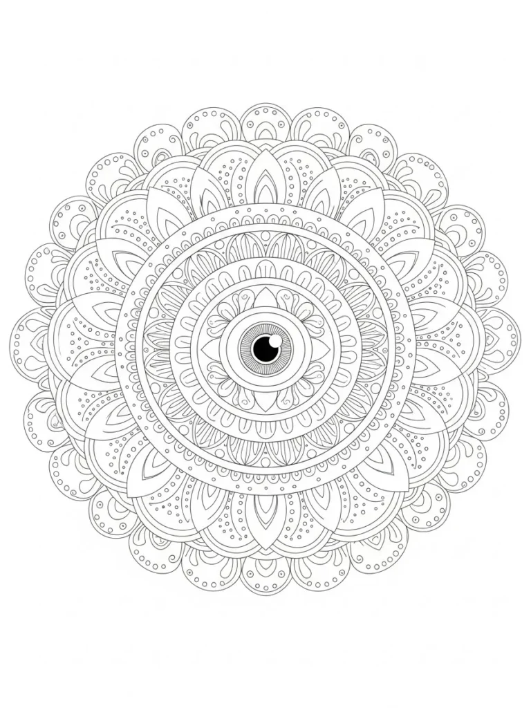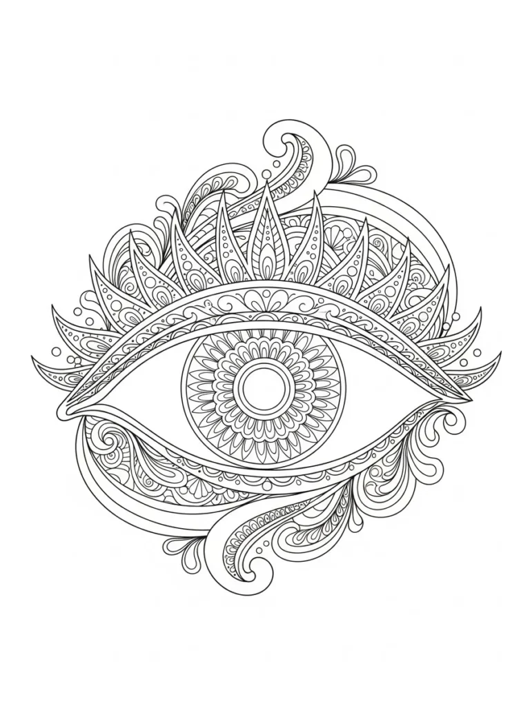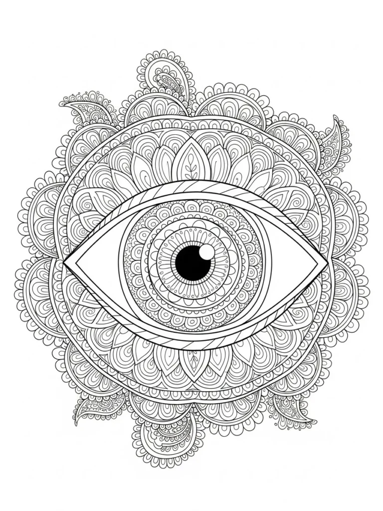 This coloring page features a striking evil eye at the center, wrapped in richly detailed mandala layers filled with paisley inspired shapes and flowing curves. Petal forms, tiny dots, and scalloped patterns stack outward in perfect symmetry, creating a lush and decorative look. The line work is fine and consistent, offering lots of intricate spaces while still keeping each section clear and well defined. The overall layout feels full and luxurious, with the eye remaining the calm focal point amid all the beautiful detail.