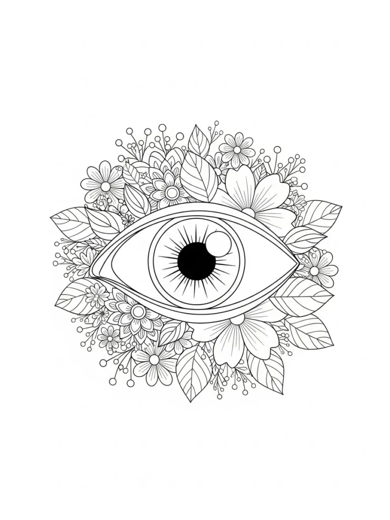 This coloring page features a bold evil eye at the center, framed by a lush arrangement of flowers, leaves, and tiny berry like details. The eye stands out with clean, smooth lines, while the surrounding florals add softness and texture through layered petals and flowing stems. The design feels balanced and natural, with medium line thickness that keeps everything clear and easy to color. The overall layout blends protection and beauty in a way that feels fresh and feminine without looking overly busy.
