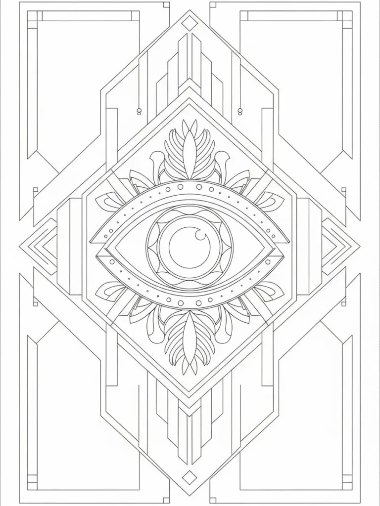 This coloring page shows a striking evil eye design framed by strong geometric shapes and clean, confident lines. The eye sits at the center inside a layered diamond layout, surrounded by symmetrical panels and elegant feather like motifs that soften the structure. The line work is smooth and precise, with a mix of thin detailing and slightly bolder outlines that help define each section. The overall layout feels architectural and stylish, almost like a vintage art deco pattern reimagined as a protective symbol.