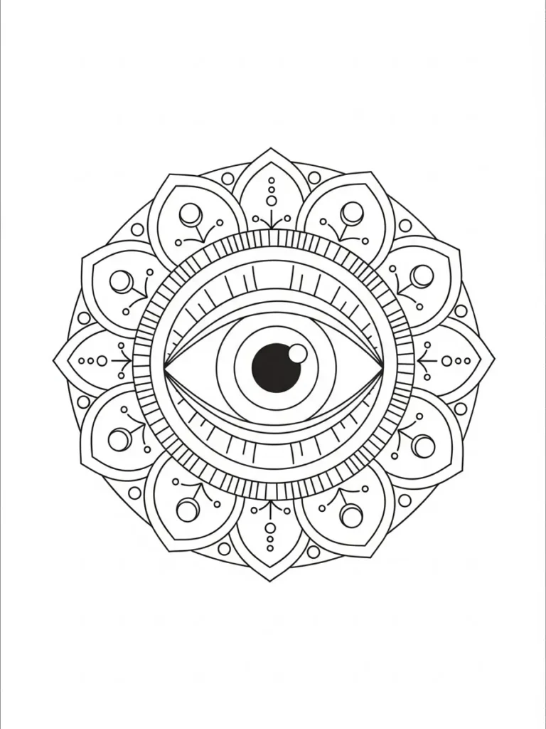 This coloring page features a classic evil eye centered inside a rounded mandala made of repeating petal shapes and gentle decorative dots. The eye itself is bold and easy to focus on, while the surrounding rings add balance with clean curved lines and evenly spaced details. Each petal has its own small accents that give the design depth without making it feel cluttered. The line thickness stays consistent throughout, which makes the whole page feel calm, polished, and very satisfying to look at before you even start coloring.